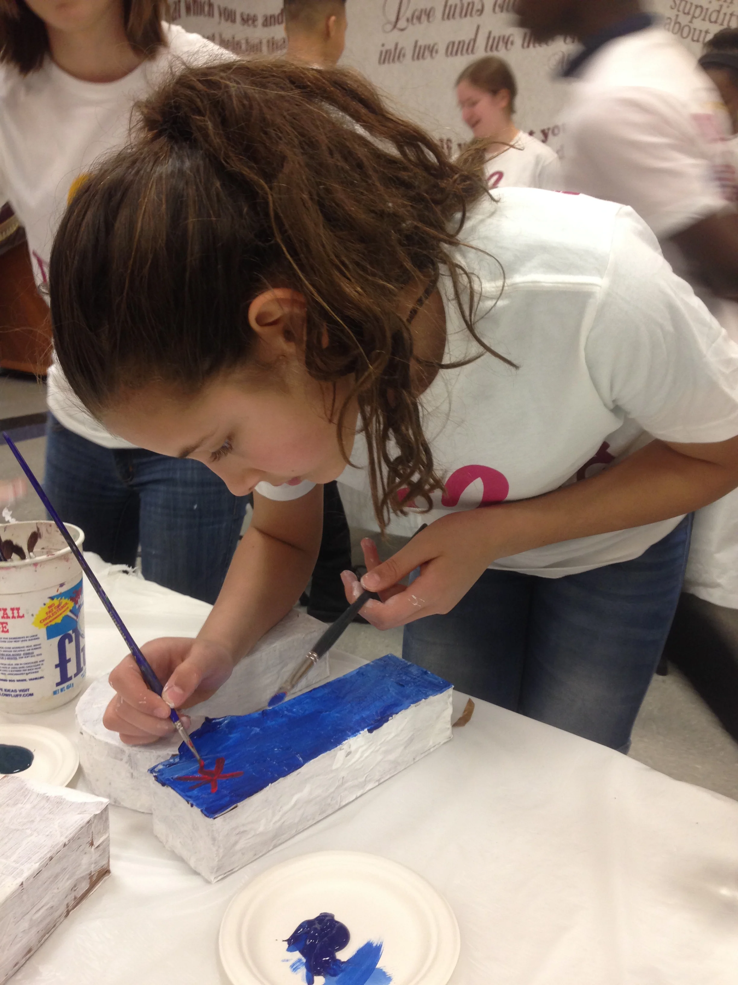 Good Deeds Day was an exciting opportunity to enliven the sad, peeling walls of the Hillel building multi-purpose room. Amalya decided to create a 3D quote. She loves building and crafts projects and decided to provide the youth with a more tactile opportunity. Each letter is built from pieces of cardboard, small paper Dixie cups and tape. Artists built the letters, applied one coat of gesso primer and then were encouraged to paint the face of their letter as creatively as possible. The sides of each letter were painted black to create uniformity among the wildly different designs.